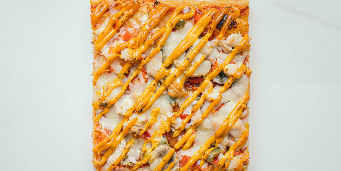 Ingredientes: Mozzarella, tomate, pollo, pimiento rojo y verde, cebolla, champiñones, salsa rustica, aceite de oliva virgen extra, sal